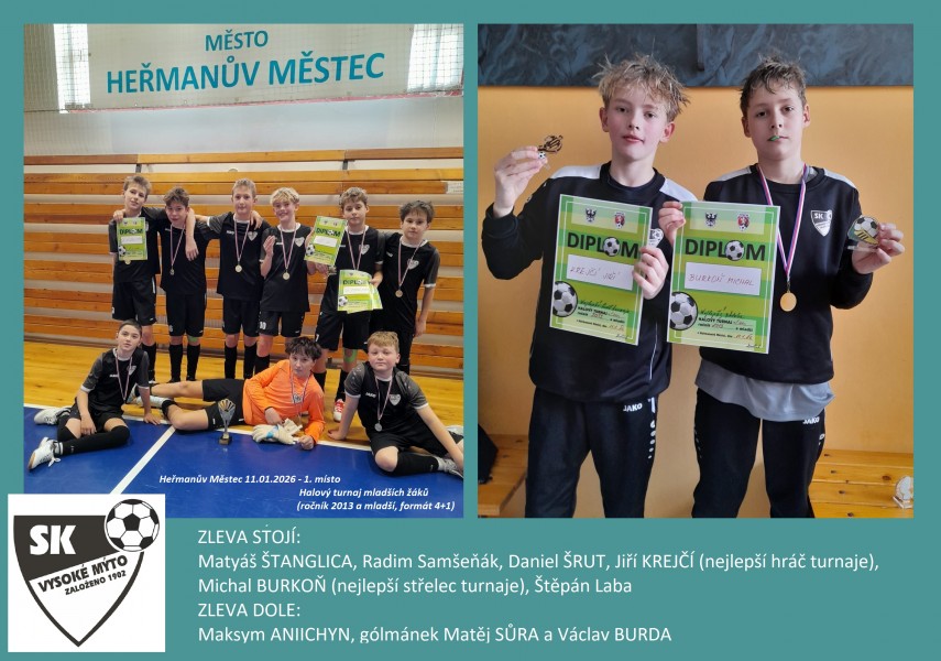 V neděli 11.1. jsme vyrazili na první letošní turnaj do Heřmanova Městce. Soupeři nebyli úplně známí a kluky jsme my trenéři při ostrém startu v hale také viděli po hodně dlouhé době. Měli jsme trošku „vykuchanou“ sestavu, ale přesto jsme si věřili a chtěli jsme po hráčích hlavně aktivní přístup se snahou co nejvíc chtít být na balonu. Zkušenější hráči, v čele s Krejčou, Burkym a v brance skvělým Sůričem, ostatní strhli a turnaj se nám vydařil. Hlavně jsme skvěle ubojovali semifinále, kdy jsme po našem marném dobývání soupeřovy branky dostali gól do naší prázdné přes celé hřiště. Čas rychle ubíhal a my zvyšovali tlak kolem soupeřovy branky. Nakonec jsme 2 vteřiny před koncem vyrovnali a hned na to parádně zvládli vstup do prodloužení, který se hrál formátem 3+1. Systémem náhle smrti jsme ve 40. vteřině vybojovali postup. Z hlediska přístupu kluků ke hře pro nás velice cenný zápas. Finále už byla jen třešnička na dortu.